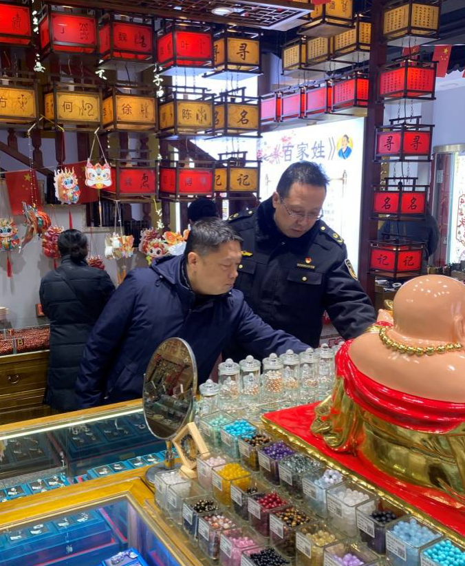 刘局一行,一是规范节日市场价格,现场巡查时着重检查不明码标价行为,提醒、规范个别商户及时摆放价签、价牌。二是加强街域摊贩及食品、餐饮户的安全检查,始终不放松“舌尖上”的安全把关,坚决杜绝商户售卖过期食品行为,督导餐饮服务商户做好后厨卫生维护。三是加强打击侵犯知识产权和制售假冒伪劣商品行为检查,突出重点产品和重点领域,杜绝售假违法行为,古文化街内老字号众多,包括 “十八街”“桂发祥”“泥人张”“崩豆张”等,重点检查以假充真、以次充好、以不合格品冒充合格品、商标侵权等行为。四是加强古文化街周边酒店、饭店安全检查,春节期间景区附近入住酒店游客繁多,酒店的特种设备安全、餐饮服务安全尤为重要,执法人员向经营者强调,加强从业人员管理,以良好的精神面貌,热情的服务质量,干净整洁的环境、安全美味的餐食接待游客。
